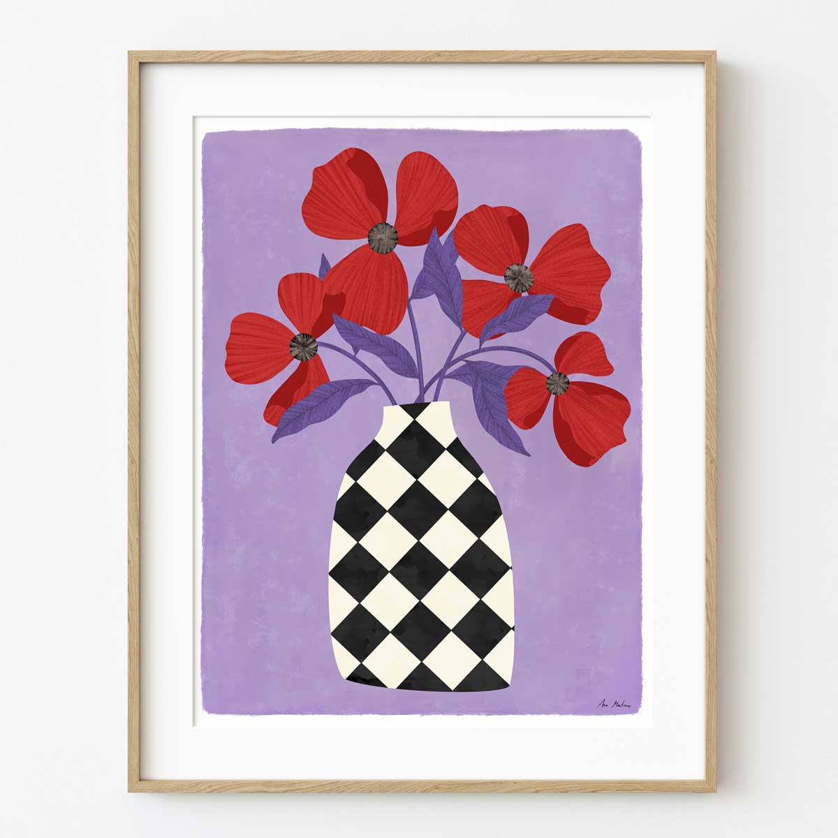 Die schwarz-weiße Vase harmoniert perfekt mit den roten Blüten und den lila Stängeln. Der sanfte Fliederton des Hintergrunds verleiht dem Druck eine entspannte Wirkung.