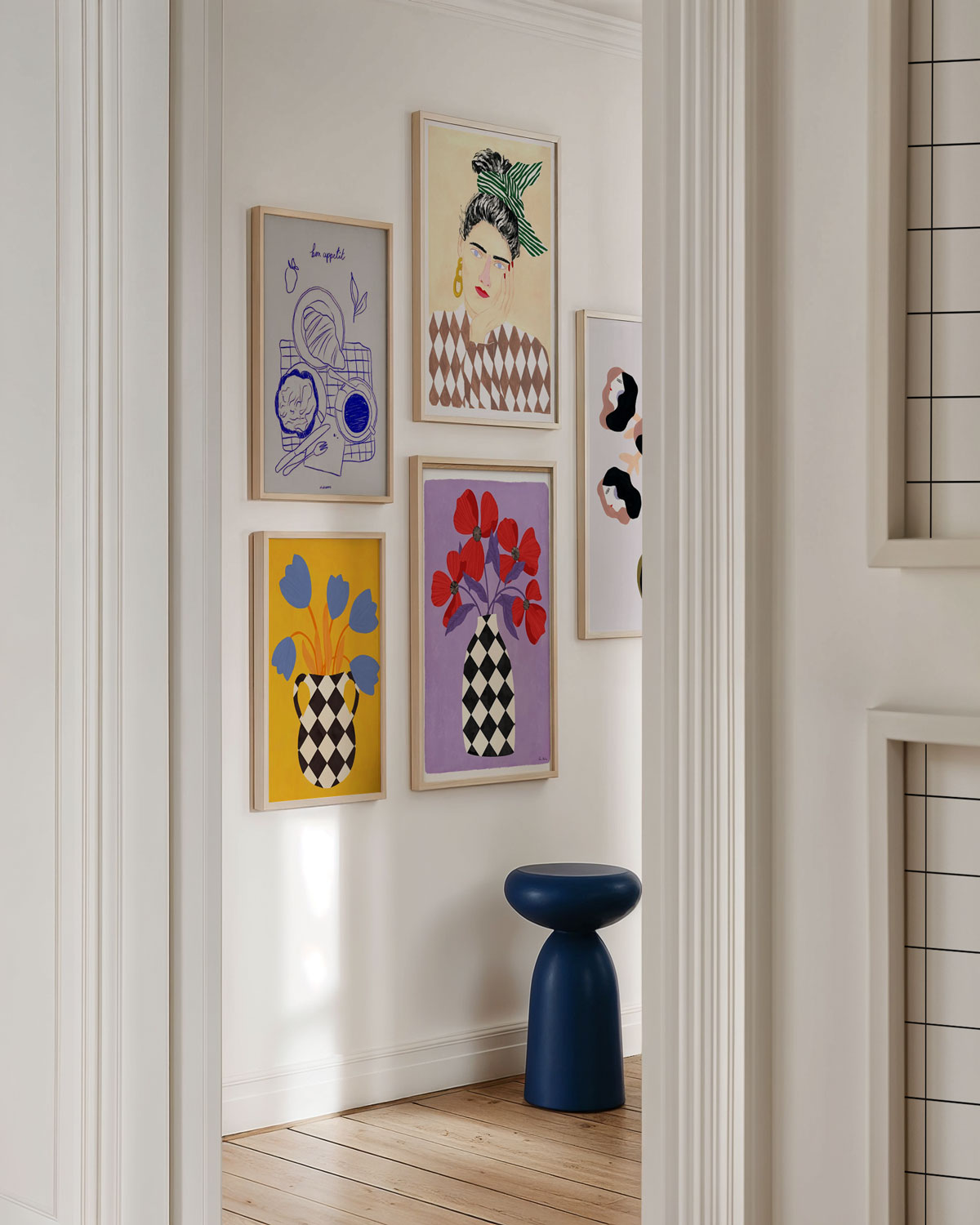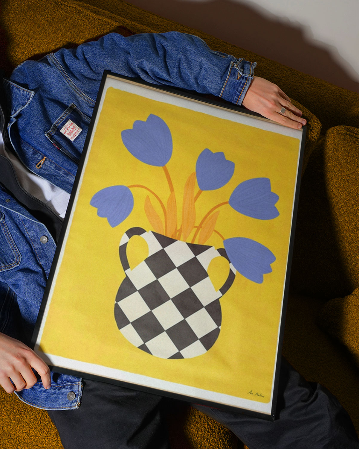 Die schwarz-weiße Vase harmoniert perfekt mit den blauen Blüten und den orangefarbenen Stängeln. Der kräftige Gelbton des Hintergrunds verleiht dem Druck eine leuchtende Wirkung.