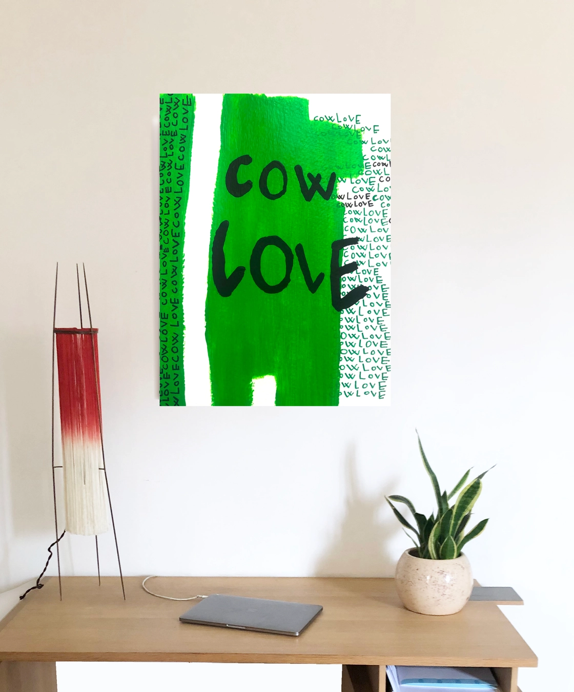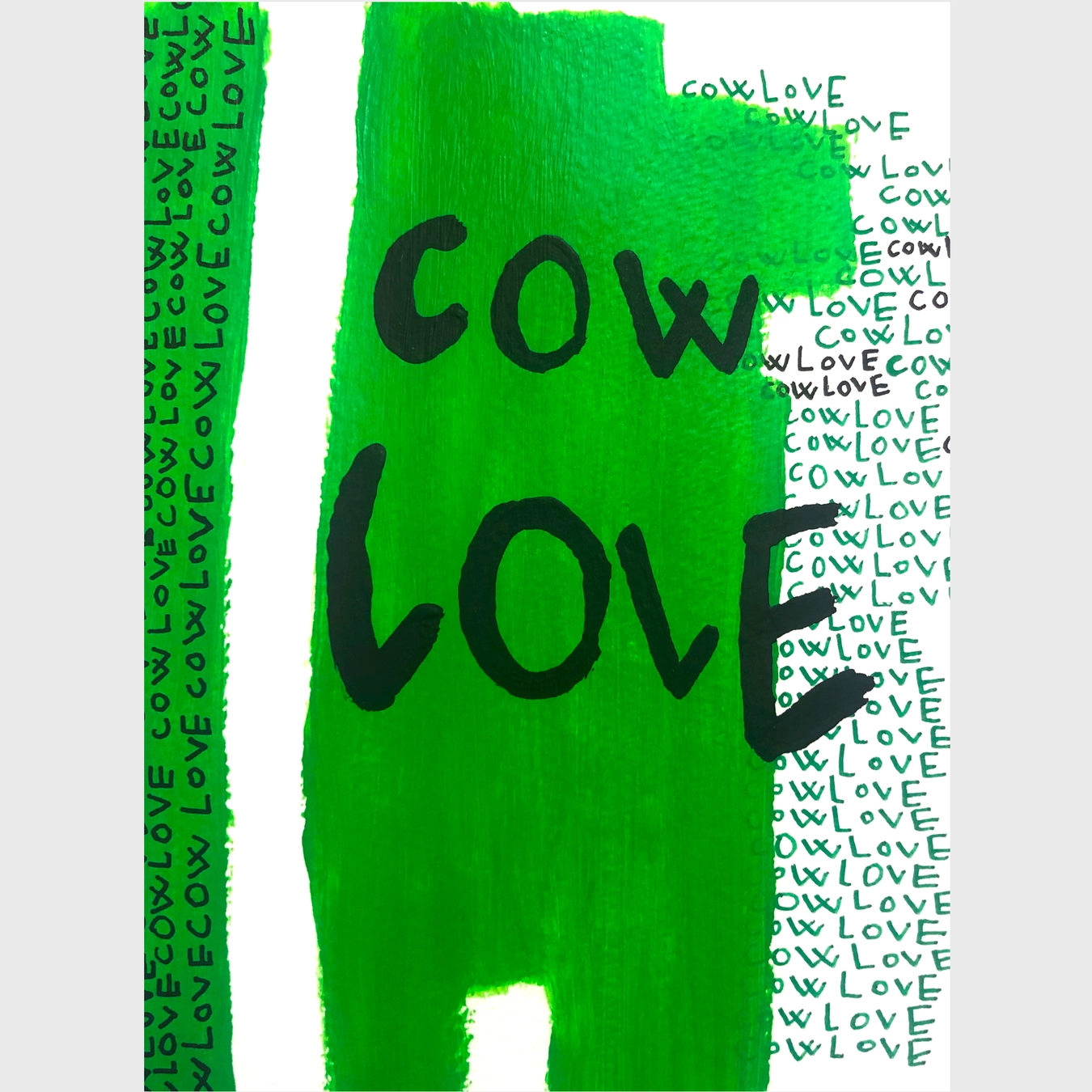 Dieser hochwertige Druck zentriert den Schriftzug „Cow Love“. Er erscheint in markanten schwarzen Lettern vor einem intensiv grün bemalten Hintergrund. Umgeben wird das Motiv von vielfach handschriftlich wiederholten Textfragmenten in Schwarz und Grün.