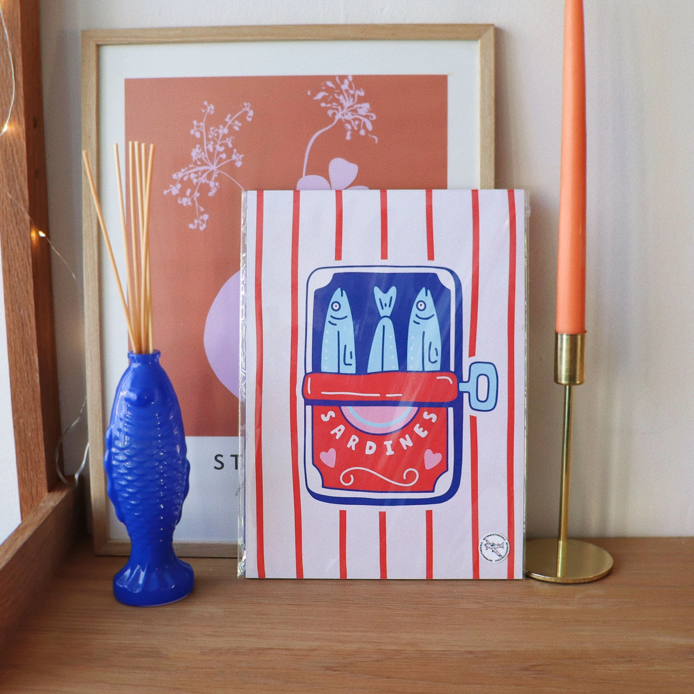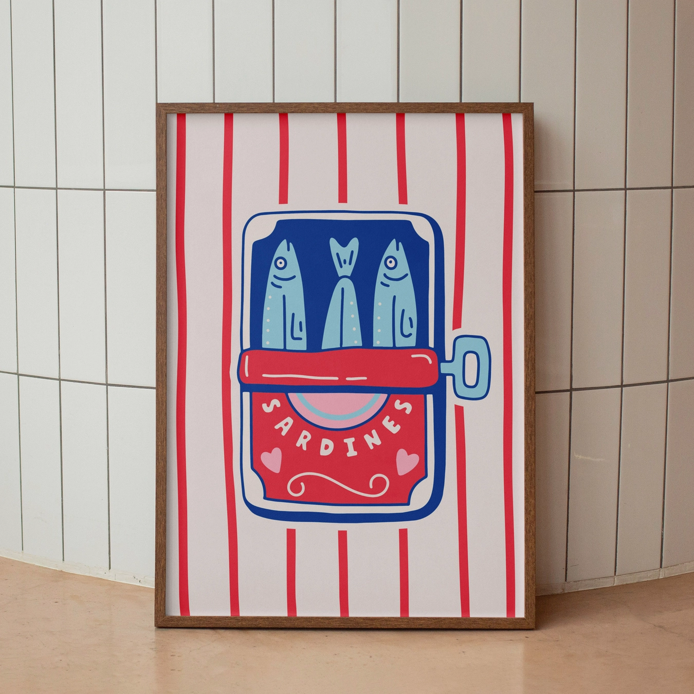 Dieser farbenfrohe Kunstdruck zeigt eine stilisierte, geöffnete Sardinendose in kräftigem Rot, Blau und Hellblau, gefüllt mit drei Fischen und verziert mit verspielten Herzdetails. Der rosa Hintergrund mit roten Streifen verleiht dem Motiv einen entspannten Retro-Look.