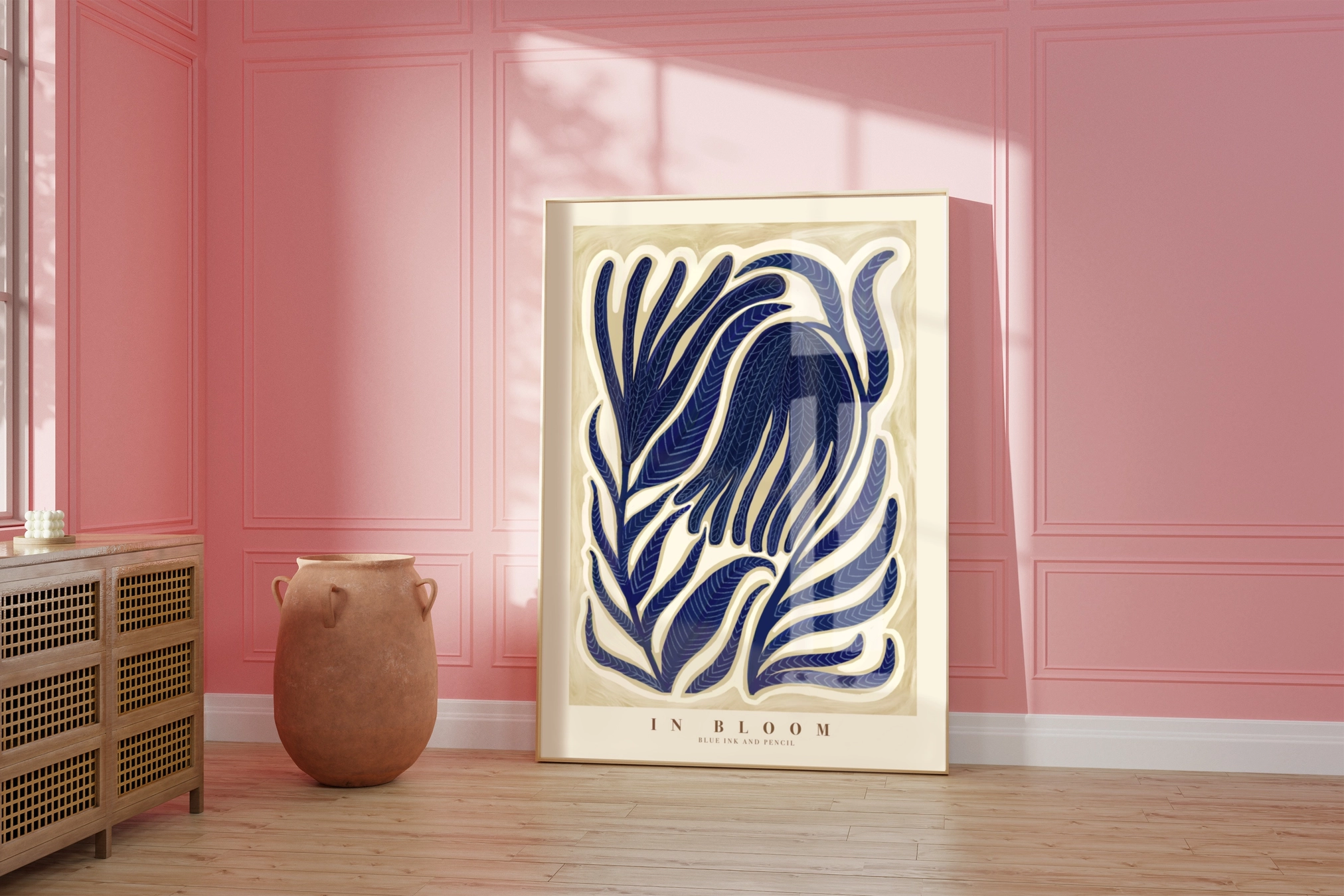 Der Print von Kate Fox Design, ein handgezeichneter Kunstdruck, zeigt stilisierte Blätter und Blüten mit kräftigen, geschwungenen Linien in sattem Dunkelblau auf beigem Hintergrund.