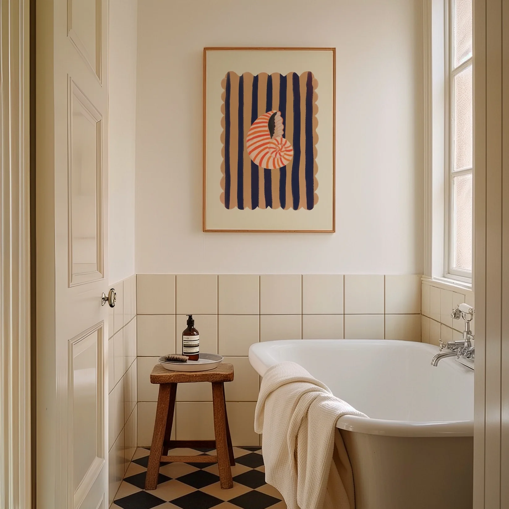 Der Print von Kate Fox Design ist ein farbenfroher, handgezeichneter Kunstdruck einer rot gesrreiften Muschel, die sich auf einem ebenfalls gestreiften Hintergund in beige und blau befindet. Der Print erinnert an die Retro Ästhetik italienischer Strandurlaube.