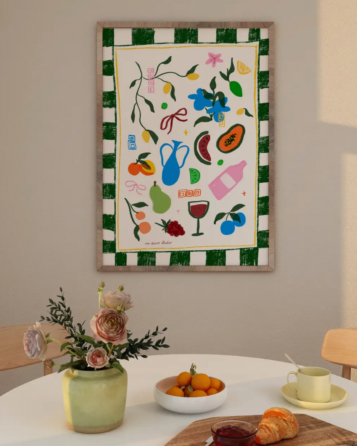 Das Motiv zeigt eine lockere Komposition kräftig bunter Elemente – darunter Früchte, Vasen und florale Details – eingerahmt von einem grün-weiß gestreiften Rand. Ideal als Farbakzent!