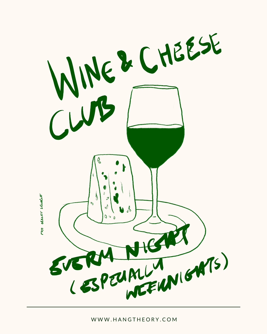 Die Illustration besteht aus einer skizzierten Darstellung von einem Weinglas und Käse, gezeichnet in kräftigem Dunkelgrün auf hellem Hintergrund. Darüber und darunter steht handschriftlich der Text: „WINE & CHEESE CLUB EVERY NIGHT (especially weeknights)”