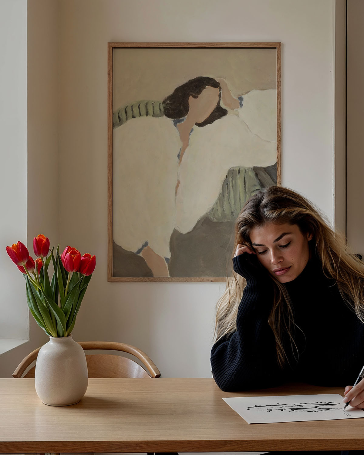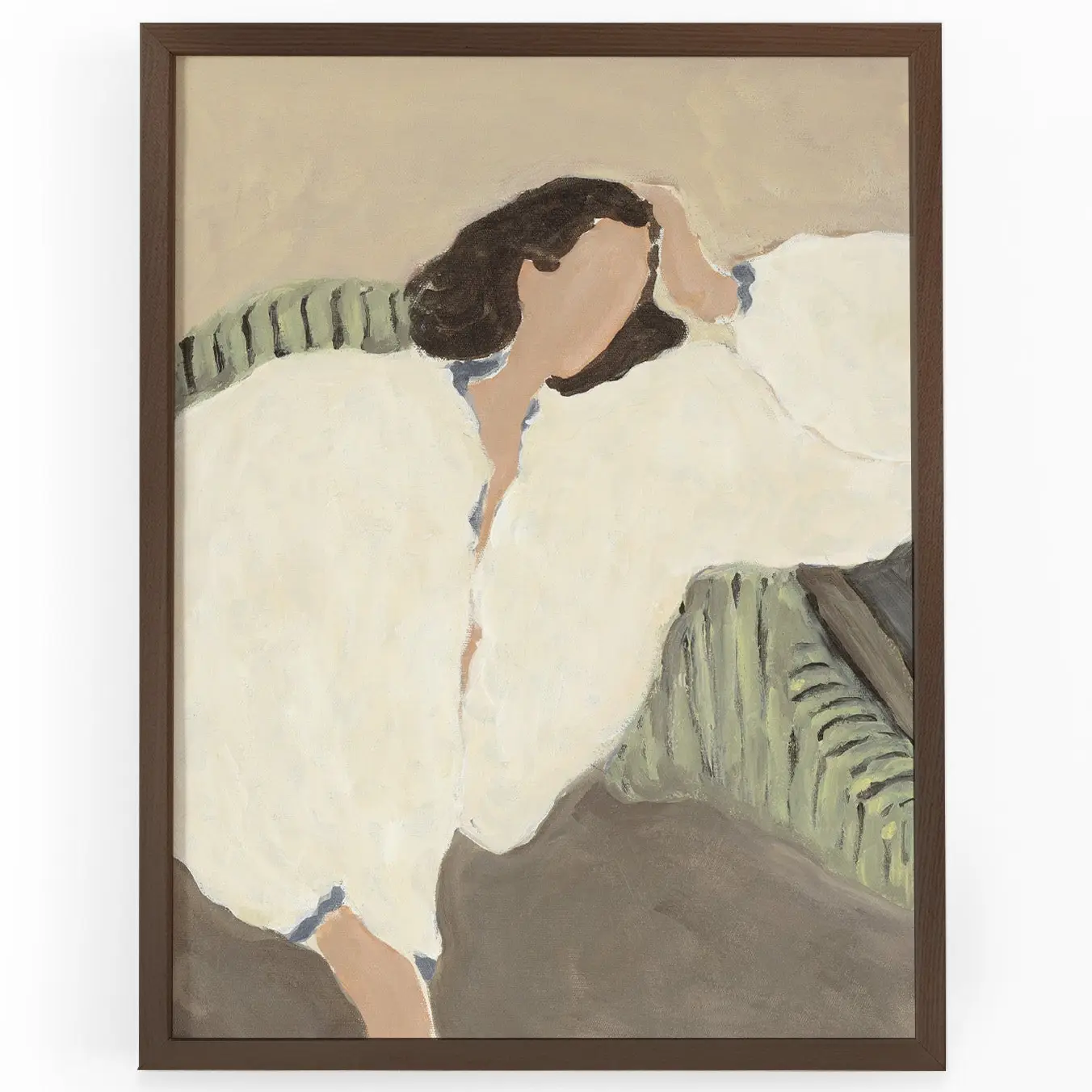 In „Dreamer“ erschaffen Sacree Frangine einen Moment der Leichtigkeit, der träumerischen Versunkenheit – eine Szene, die still und dennoch voller Gefühl ist. Die Figur liegt entspannt auf einem Sofa, der Blick abgewendet, umhüllt von weichen, hellen Stoffen und umgeben von natürlichen Tönen. Die zurückhaltende Farbpalette – Creme, Olivgrün und Erdtöne – vermittelt eine wohltuende Ruhe.
