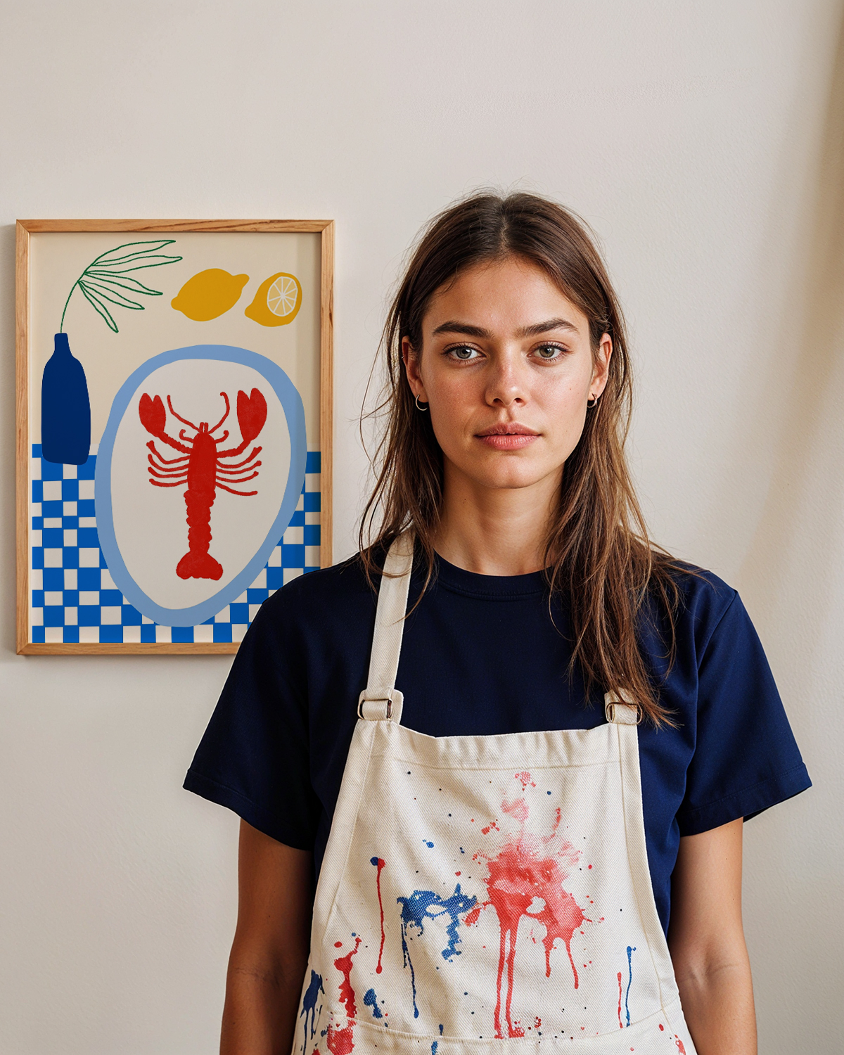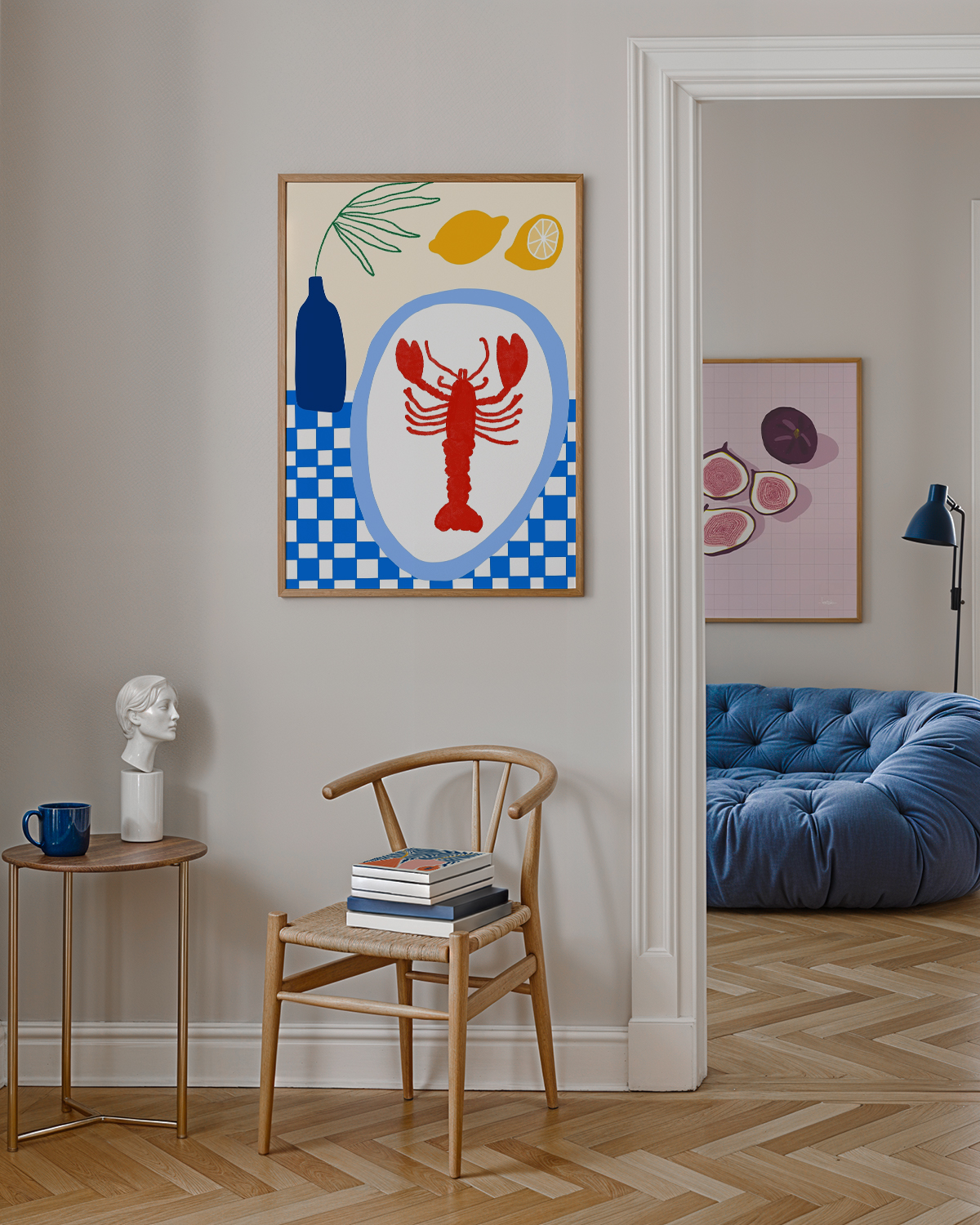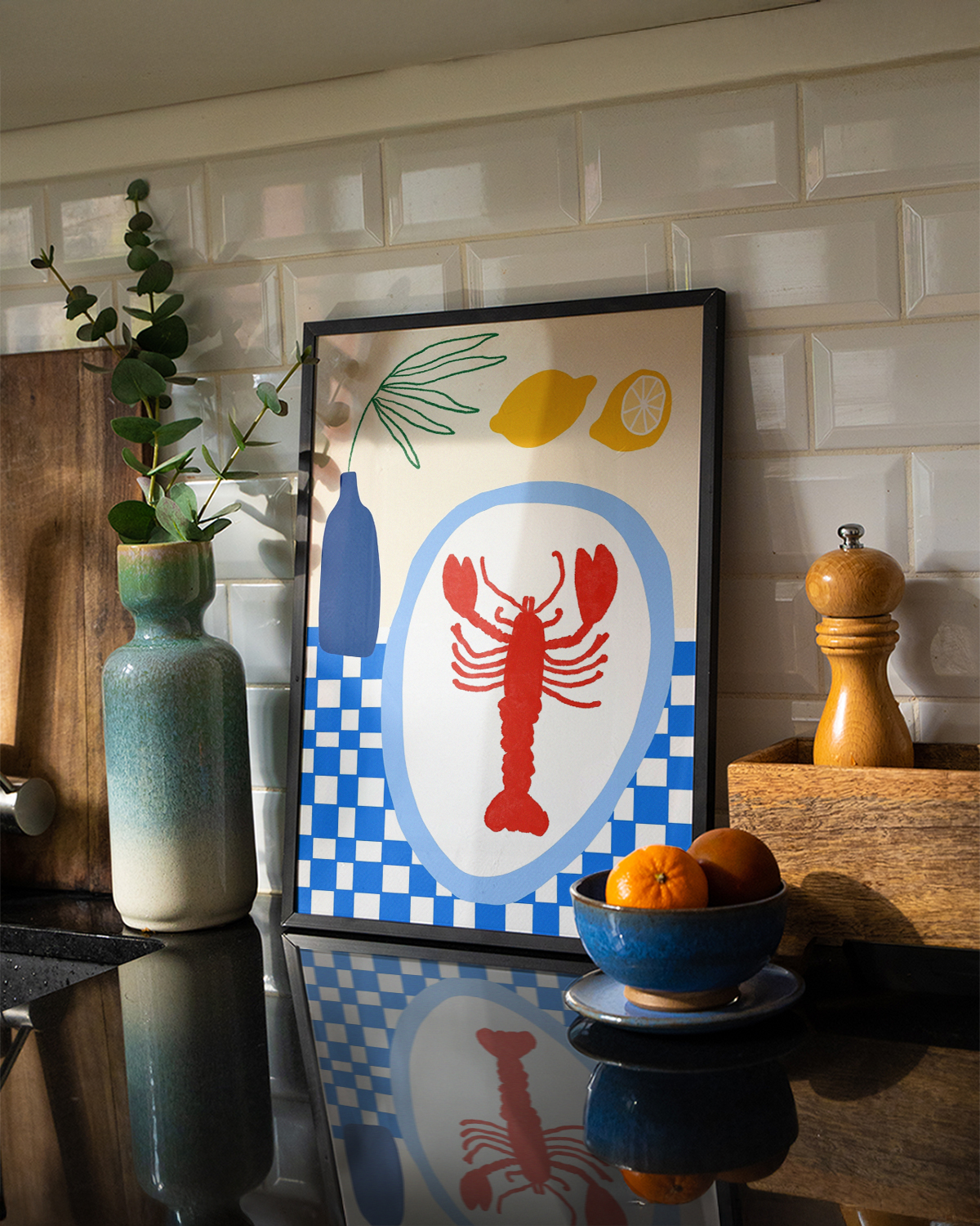 Der Kunstdruck „The Lobster Lunch“ von Teresa Rego bringt die Küstenstimmung der heißen Sommertage mit Meeresfrüchten und frischen Zitronen zurück.